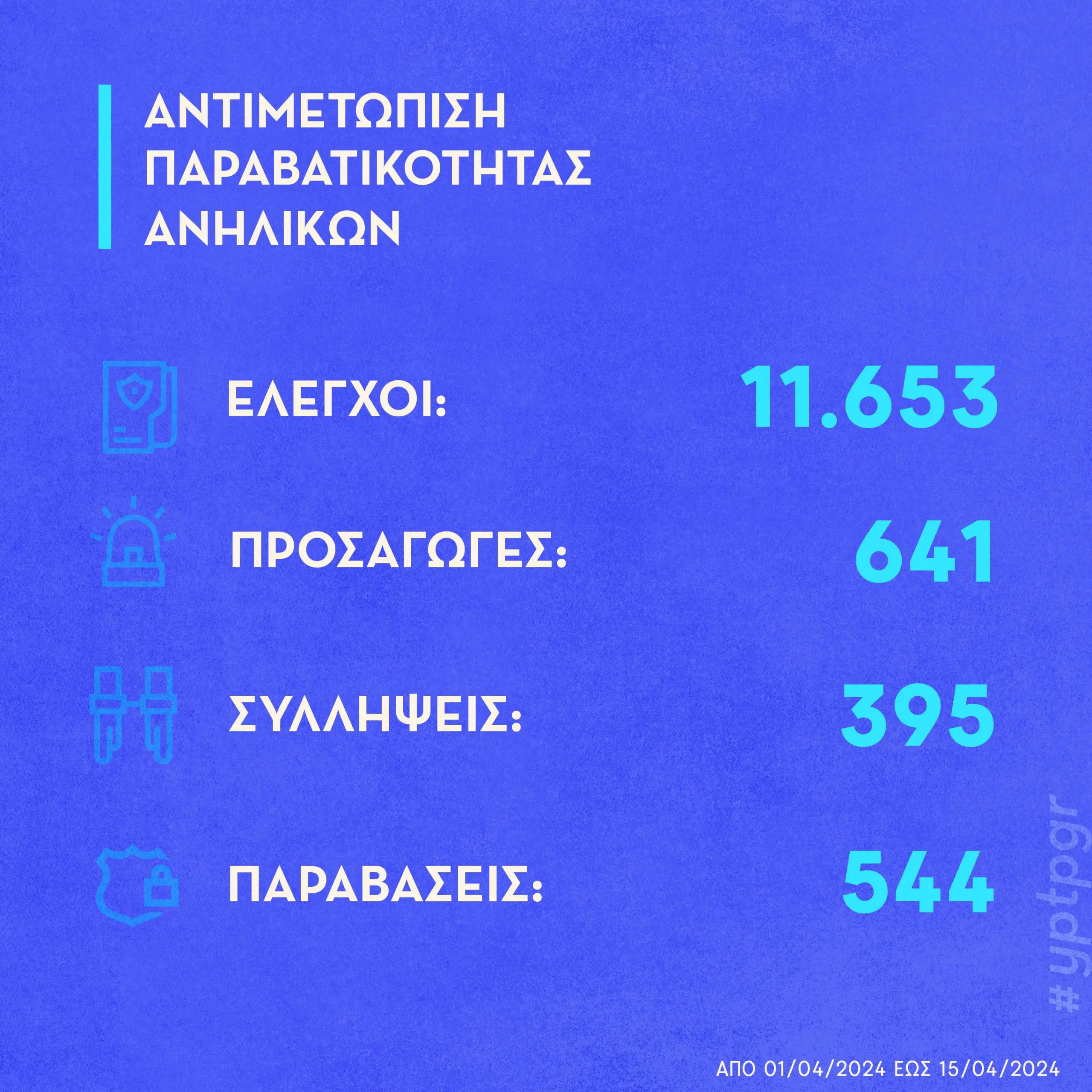 Παράλληλα, για την πρόληψη και αντιμετώπιση της νεανικής παραβατικότητας και της βίας μεταξύ ανηλίκων η Αστυνομία πραγματοποίησε σε όλη την επικράτεια 11.653 ελέγχους ατόμων και προχώρησε 641 προσαγωγές, 395 συλλήψεις ενώ βεβαιώθηκαν 544 παραβάσεις.
