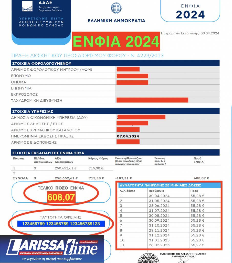 Εφόσον δεν έχει καμία αλλαγή στην περιουσιακή του κατάσταση θα πρέπει το ποσό του φόρου που αναγράφεται να είναι το ίδιο ή και χαμηλότερο με το περυσινό, ενώ ως καταληκτική ημερομηνία πληρωμής του φόρου αναφέρει το σημείωμα την 30η Απριλίου 2024.