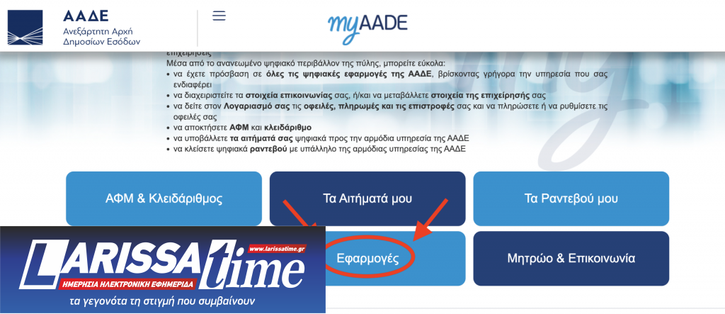 Το πρώτο από τα εννέα κλικ που πρέπει να κάνουν οι ιδιοκτήτες ακινήτων, για να μπορέσουν να εκτυπώσουν το εκκαθαριστικό ΕΝΦΙΑ ,είναι να εισέλθουν στην ανανεωμένη ιστοσελίδα της Ανεξάρτητης Αρχής Δημοσίων Εσόδων (www.aade.gr) και στη συνέχεια να βρουν το «MyΑΑDE» και την επιλογή «Εφαρμογές».