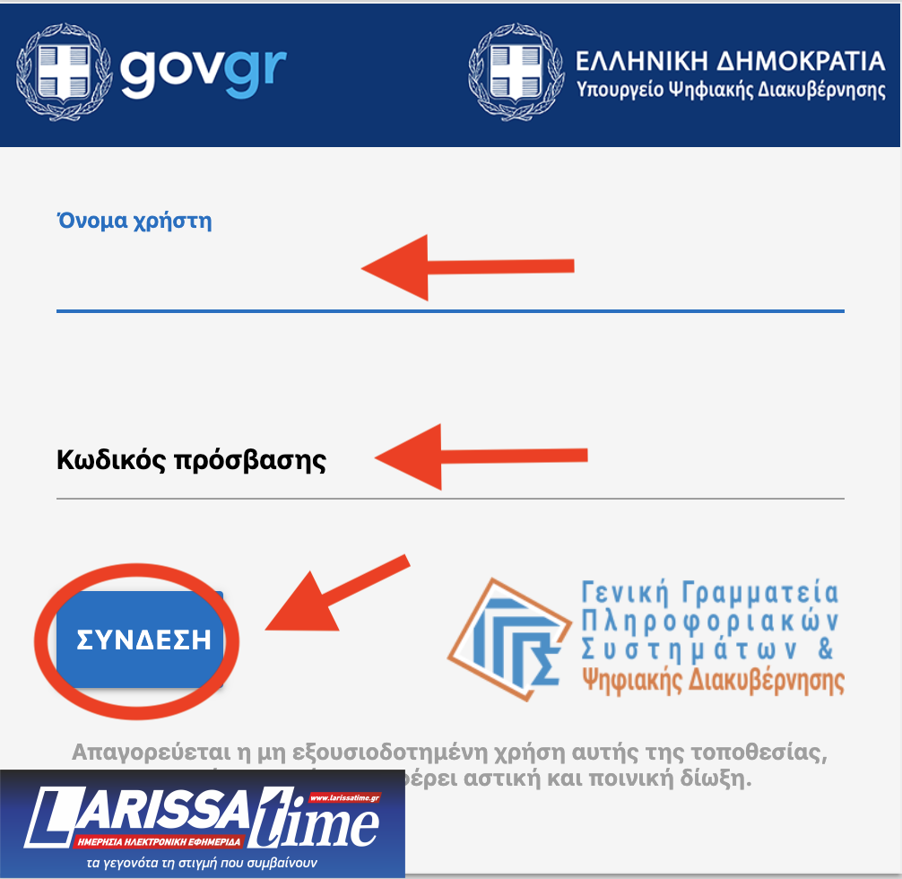 Το επόμενο βήμα είναι να του ζητηθεί να συμπληρώσει το «όνομα χρήστη» και τον κωδικό πρόσβασης που είναι οι ίδιοι κωδικοί που χρησιμοποιεί για την συμπλήρωση και υποβολή της φορολογικής δήλωσής του.
