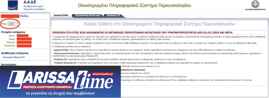 Εφόσον όλα έχουν γίνει σωστά ο φορολογούμενος θα βρεθεί σε μία σελίδα όπου αριστερά αναγράφεται «Έτος», «Στοιχεία υπόχρεου», «Διαθέσιμες ενέργειες», «Εκτυπώσεις». Το πρώτο πράγμα που θα δει είναι ότι εκεί που αναγράφει «Ετος» εμφανίζει την επιλογή «2025». ![]()