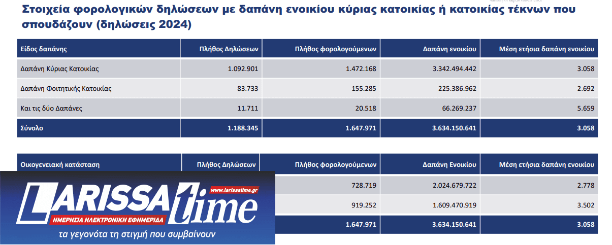 Σύμφωνα με τα στοιχεία των φορολογικών δηλώσεων του έτους 2024 (φορολογικό έτος 2023) που επικαλείται η κυβέρνηση, δαπάνη ενοικίου είτε για κύρια κατοικία, είτε για φοιτητική κατοικία δήλωσαν 1.188.345 νοικοκυριά που αντιστοιχούν σε 1.647.971 φορολογούμενους. Η συνολική δαπάνη ενοικίου που δηλώθηκε ανέρχεται σε 3,6 δισ. ευρώ και το μέσο ετήσιο ενοίκιο ανά νοικοκυριό σε 3.058 ευρώ.