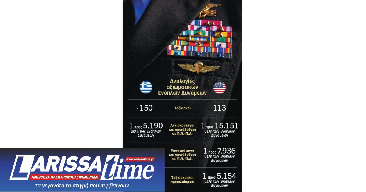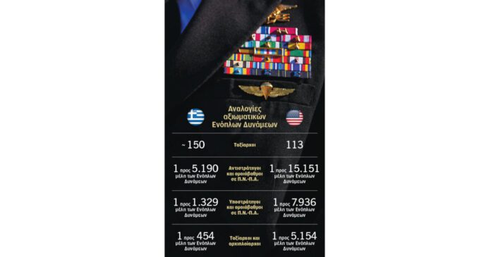 Στις ΗΠΑ η αναλογία αυτή είναι ένας ανά 15.151 μέλη των ενόπλων δυνάμεων ενώ στην Ελλάδα ένας ανά 5.190. Ακόμη πιο αποκαλυπτική είναι η σύγκριση στην κατηγορία των υποστρατήγων και ομοιόβαθμων σε Πολεμικό Ναυτικό και Πολεμική Αεροπορία. Στις ΗΠΑ αναλογούν ένας υποστράτηγος ανά 7.936 μέλη των ενόπλων δυνάμεων, ενώ στην Ελλάδα ένας ανά 1.329 μέλη. Υπενθυμίζεται ότι στις έκτακτες κρίσεις της περασμένης Παρασκευής οι περισσότερες αποστρατείες αφορούσαν ακριβώς τον βαθμό των υποστρατήγων.