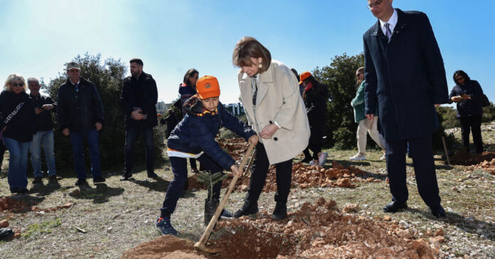 Οι παιδικές φωνές που από νωρίς αντηχούσαν στο πλάτωμα της Πάρνηθας, κοντά στο Μον Παρνές, ήταν η καλύτερη υποδοχή που θα μπορούσαν να έχουν η Πρόεδρος της Δημοκρατίας Κατερίνα Σακελλαροπούλου και οι γυναίκες πρέσβεις δεκαεπτά ξένων χωρών στην Αθήνα, που έφθασαν εκεί λίγο πριν από τις 11 χθες το πρωί. Τα παιδιά, μαθητές και μαθήτριες του 3ου Δημοτικού Σχολείου Αγίας Παρασκευής, κρατούσαν σημαίες που τα ίδια είχαν ζωγραφίσει και αντιστοιχούσαν στις χώρες των οποίων οι γυναίκες πρέσβεις ανταποκρίθηκαν στην πρόσκληση της Προέδρου της Δημοκρατίας για συμβολική δενδροφύτευση με αφορμή τη χθεσινή Διεθνή Ημέρα Δασών. Μακριά από το αυστηρό πρωτόκολλο που ο ρόλος τους επιτάσσει, η Πρόεδρος και οι πρέσβεις μαζί με τα παιδιά ρίχτηκαν στη δενδροφύτευση. Σε μια έκταση τεσσάρων στρεμμάτων, που είχε καεί στην πυρκαγιά του 2007, φυτεύτηκαν μικρά έλατα για να συμπληρώσουν και να ενισχύσουν την ήδη ορατή φυσική αναγέννηση του δάσους. Η Πρόεδρος της Δημοκρατίας ευχαρίστησε τις γυναίκες πρέσβεις που ανταποκρίθηκαν στην πρόσκλησή της «να κάνουμε μαζί μια δενδροφύτευση στην Πάρνηθα, σε μια συμβολική κίνηση ανανέωσης της δέσμευσής μας να προστατεύσουμε τον πολύτιμο φυσικό μας πλούτο». Και υπογράμμισε ότι «τα δάση είναι εξαιρετικής σημασίας για τον άνθρωπο, το περιβάλλον, τη βιοποικιλότητα. Η βιώσιμη διαχείριση είναι ο μόνος ενδεδειγμένος τρόπος για να προφυλάξουμε αυτό το πολύτιμο φυσικό στοιχείο, τόσο για εμάς όσο και, κυρίως, για τις επόμενες γενιές». Ακολούθησε ενημέρωση στο Καταφύγιο, όπου ο υπουργός Περιβάλλοντος και Ενέργειας Θόδωρος Σκυλακάκης ανέλυσε τις προκλήσεις της κλιματικής κρίσης και τις προτεραιότητες για την αντιμετώπισή τους, ενώ οι υπεύθυνοι της Γενικής Διεύθυνσης Δασών και Δασικού Περιβάλλοντος μίλησαν για τη σημασία του Εθνικού Δρυμού της Πάρνηθας.
