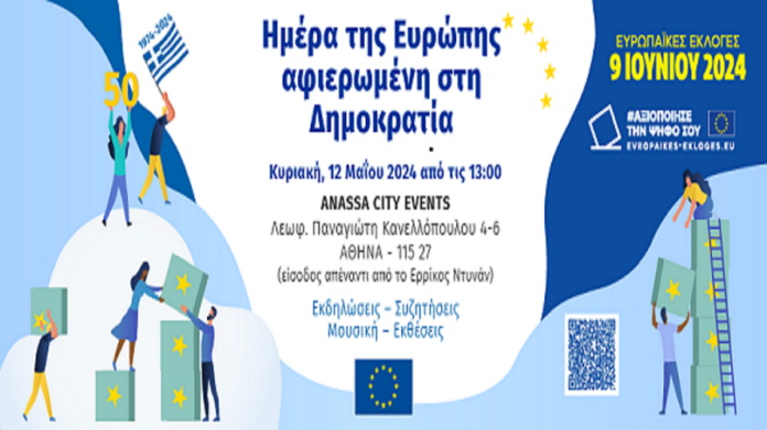 Η Ημέρα της Ευρώπης είναι φέτος αφιερωμένη στα 50 χρόνια από την αποκατάσταση της Δημοκρατίας στην Ελλάδα, με συζητήσεις και εκδηλώσεις εν όψει των επερχόμενων Ευρωπαϊκών Εκλογών και την παρουσία του Αντιπρόεδρου της Ευρωπαϊκής Επιτροπής αρμόδιου για την Προώθηση του Ευρωπαϊκού τρόπου ζωής μας, κ. Μαργαρίτη Σχοινά, ο οποίος θα συνομιλήσει με νέες και νέους σε εκδήλωση ανοιχτού διαλόγου, , την οποία θα συντονίσει ο κ. Γιώργος Πασπαράκης.