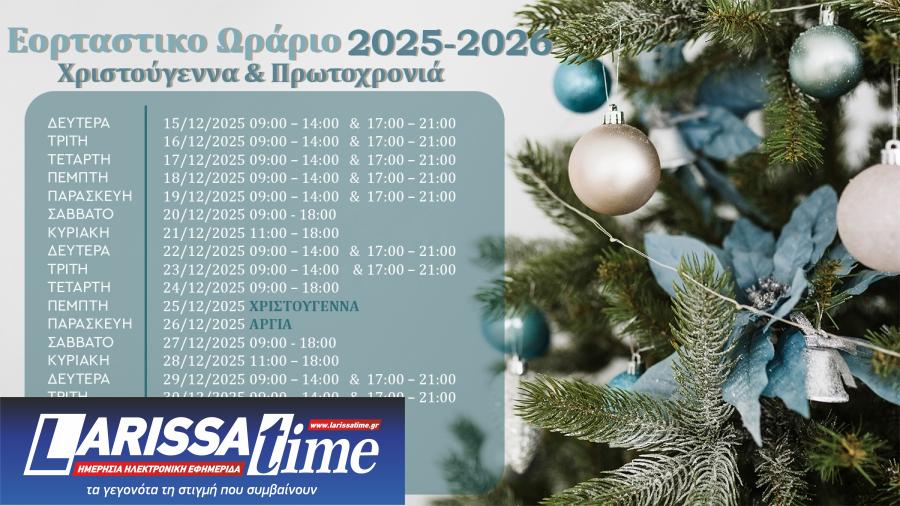 Το εορταστικό ωράριο λειτουργίας Χριστουγέννων 2025 & Πρωτοχρονιάς 2026, στην εμπορική αγορά της Λάρισας, διαμορφώνεται ως εξής: