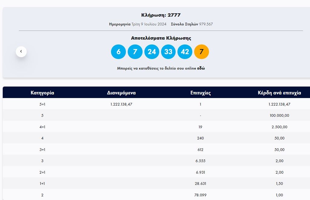 Συνολικά χάρισε στον κάτοχό του το ποσό των €1.222.138,47.