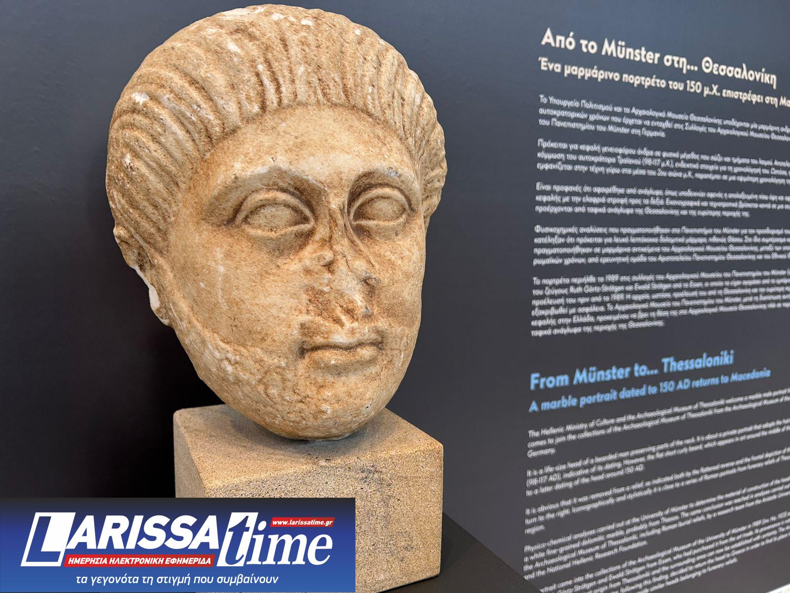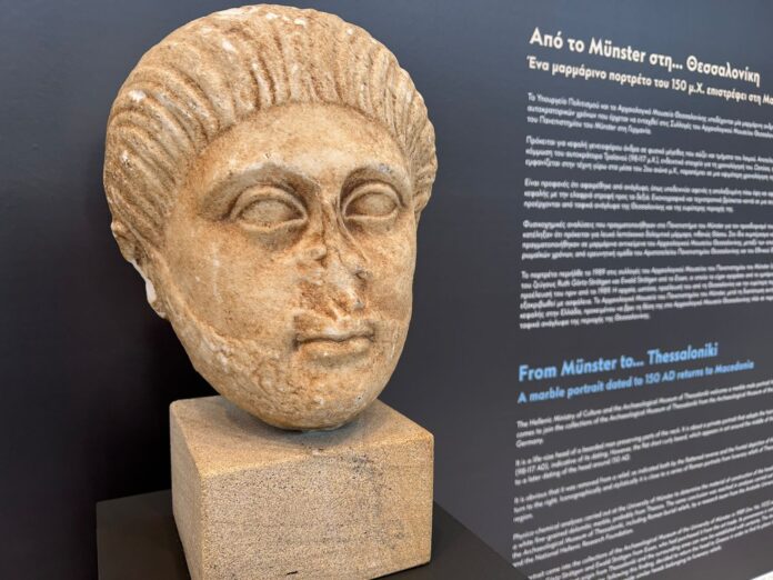 Το Αρχαιολογικό Μουσείο Θεσσαλονίκης, παρουσία της Υπουργού Πολιτισμού, υποδέχθηκε μαρμάρινη ανδρική κεφαλή, ρωμαϊκών χρόνων, που επιστράφηκε από το Αρχαιολογικό Μουσείο του Πανεπιστημίου του Μύνστερ, της Γερμανίας. Η εικονιστική κεφαλή (πορτρέτο) γενειοφόρου άνδρα συνδυάζει τη χαρακτηριστική κόμμωση των χρόνων του αυτοκράτορα Τραϊανού (98-117 μ.Χ.) με την οψιμότερη επίπεδη απόδοση της γενειάδας. Χρονολογείται, γύρω στα 150 μ.Χ., και αποτελεί τμήμα ταφικού αναγλύφου που προέρχεται από νεκροταφείο της Θεσσαλονίκης ή από την ευρύτερη περιοχή της. Πλέον εκτίθεται μόνιμα στο Αρχαιολογικό Μουσείο Θεσσαλονίκης, πλάι σε ανάλογα πορτρέτα.