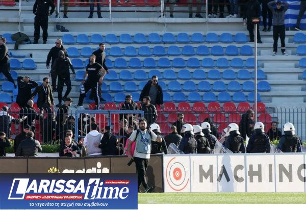 Αναλυτικά, λίγο πριν από την ανάπαυλα της αναμέτρησης, επικράτησε ένταση μεταξύ των φίλων των δύο ομάδων, με την κατάσταση να κλιμακώνεται και να υπάρχει ανταλλαγή αντικειμένων και καρεκλών.