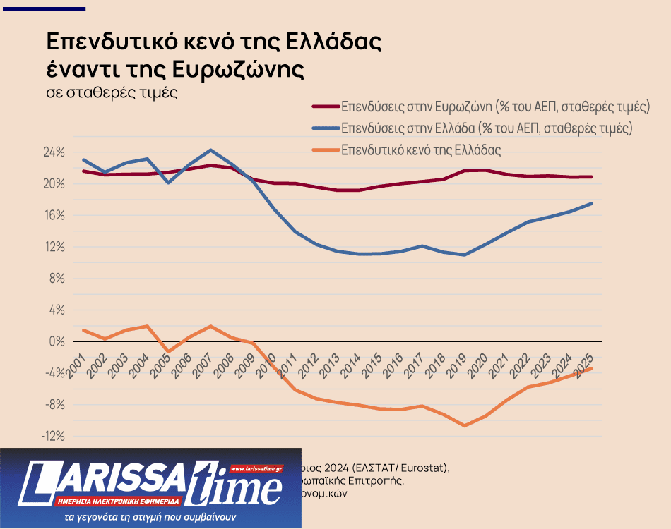 Μεγάλο πρόβλημα παραμένει το επενδυτικό κενό στην Ελλάδα, κάτι το οποίο επισημαίνει πλήθος οικονομικών αναλυτών σχετικά με την ελληνική οικονομία. Αν και εμφανίζεται μια τάση μείωσης της «ψαλίδας» με την Ευρώπη, το ζήτημα παραμένει υπαρκτό και δείχνει ότι η χώρα μας είναι…πίσω.