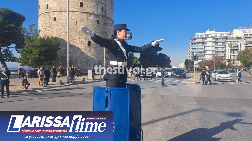 Η αστυφύλακας Β. Βεϊσάκη ανέβηκε σήμερα, παραμονή Πρωτοχρονιάς, στο βαρέλι του τροχονόμου μπροστά από τον Λευκό Πύργο και ρύθμισε την κυκλοφορία των οχημάτων.