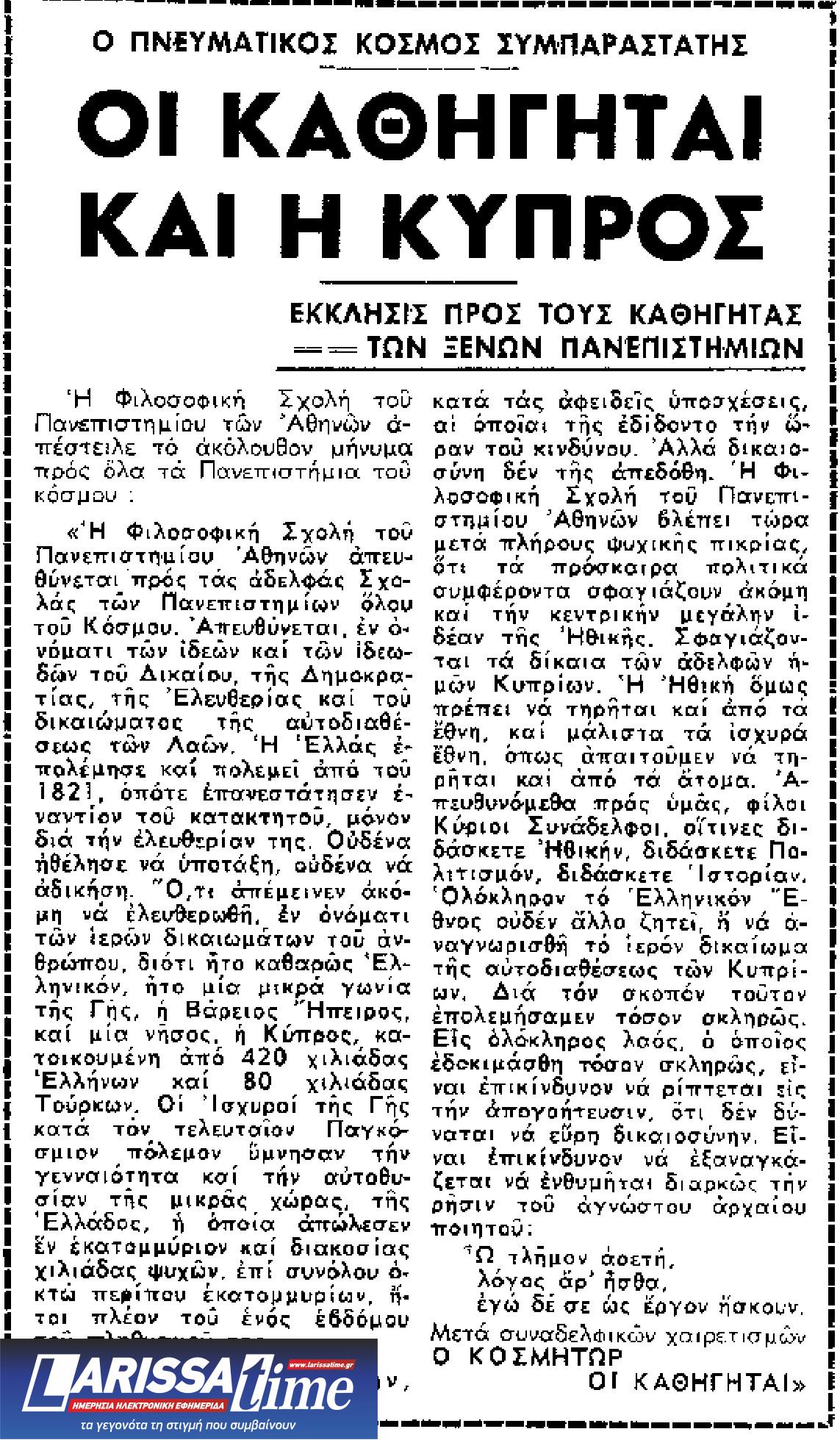 Δημοσίευμα της εφημερίδας το ΒΗΜΑ, 5 Φεβρουαρίου 1964, για την παρέμβαση της Φιλοσοφικής Σχολής προς καθηγητές ξένων Πανεπιστημίων για συμπαράσταση στον αγώνα των Κυπρίων για αυτοδιάθεση