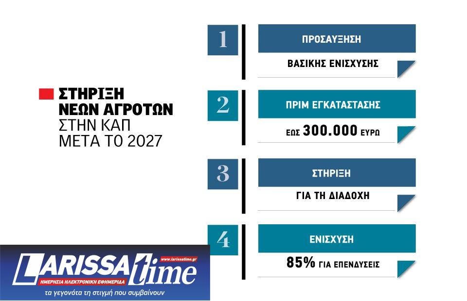 - Στήριξη για την εκκίνηση αγροτικών επιχειρήσεων. Πρόκειται για στήριξη εγκατάστασης έως 300.000 ευρώ που αφορά νεοεισερχόµενους αγρότες, που δεν είναι απαραίτητα και νέοι σε ηλικία.