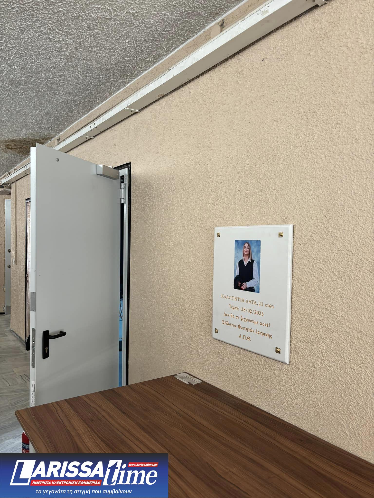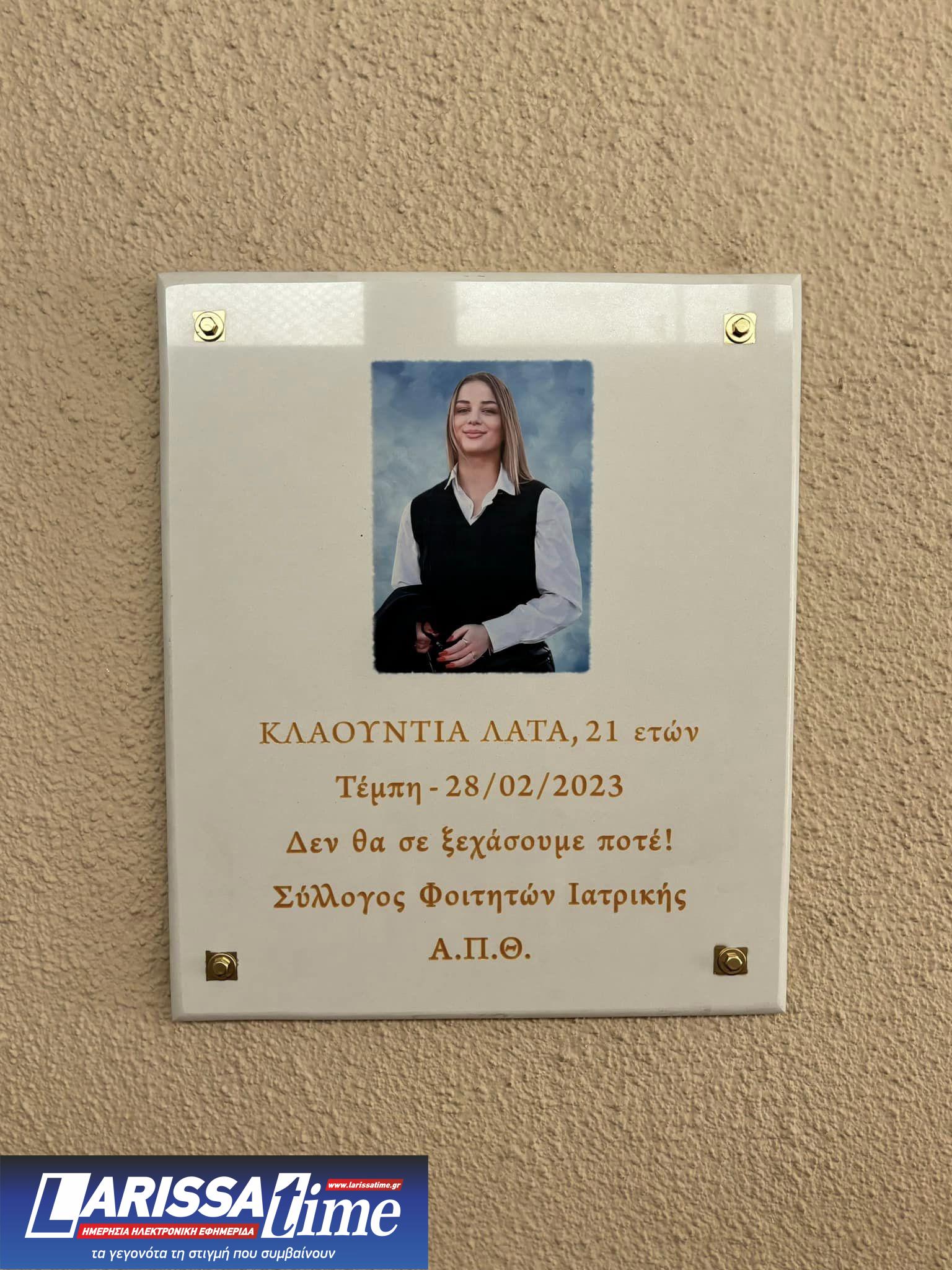 Μια μαρμάρινη επιγραφή, που φέρει τη φωτογραφία της αδικοχαμένης φοιτήτριας Ιατρικής ΣΣΑΣ, Κλαούντια Λάτα, και τη φράση “Δεν θα σε ξεχάσουμε ποτέ”, κοσμεί από την Πέμπτη, 11 Ιουλίου, τον διάδρομο πέριξ του Αμφιθεάτρου Α’ του Τμήματος Ιατρικής του ΑΠΘ.