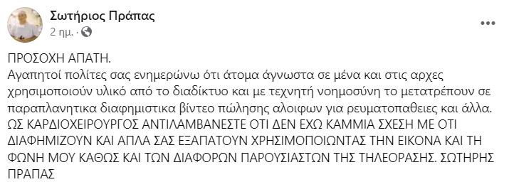 «ΠΡΟΣΟΧΗ ΑΠΑΤΗ. Αγαπητοί πολίτες σας ενημερώνω ότι άτομα άγνωστα σε μένα και στις αρχές χρησιμοποιούν υλικό από το διαδίκτυο και με τεχνητή νοημοσύνη το μετατρέπουν σε παραπλανητικά διαφημιστικά βίντεο πώλησης αλοιφών για ρευματοπάθειες και άλλα. ΩΣ ΚΑΡΔΙΟΧΕΙΡΟΥΡΓΟΣ ΑΝΤΙΛΑΜΒΑΝΕΣΤΕ ΟΤΙ ΔΕΝ ΕΧΩ ΚΑΜΜΙΑ ΣΧΕΣΗ ΜΕ ΟΤΙ ΔΙΑΦΗΜΙΖΟΥΝ ΚΑΙ ΑΠΛΑ ΣΑΣ ΕΞΑΠΑΤΟΥΝ ΧΡΗΣΙΜΟΠΟΙΩΝΤΑΣ ΤΗΝ ΕΙΚΟΝΑ ΚΑΙ ΤΗ ΦΩΝΗ ΜΟΥ ΚΑΘΩΣ ΚΑΙ ΤΩΝ ΔΙΑΦΟΡΩΝ ΠΑΡΟΥΣΙΑΣΤΩΝ ΤΗΣ ΤΗΛΕΟΡΑΣΗΣ. ΣΩΤΗΡΗΣ ΠΡΑΠΑΣ»