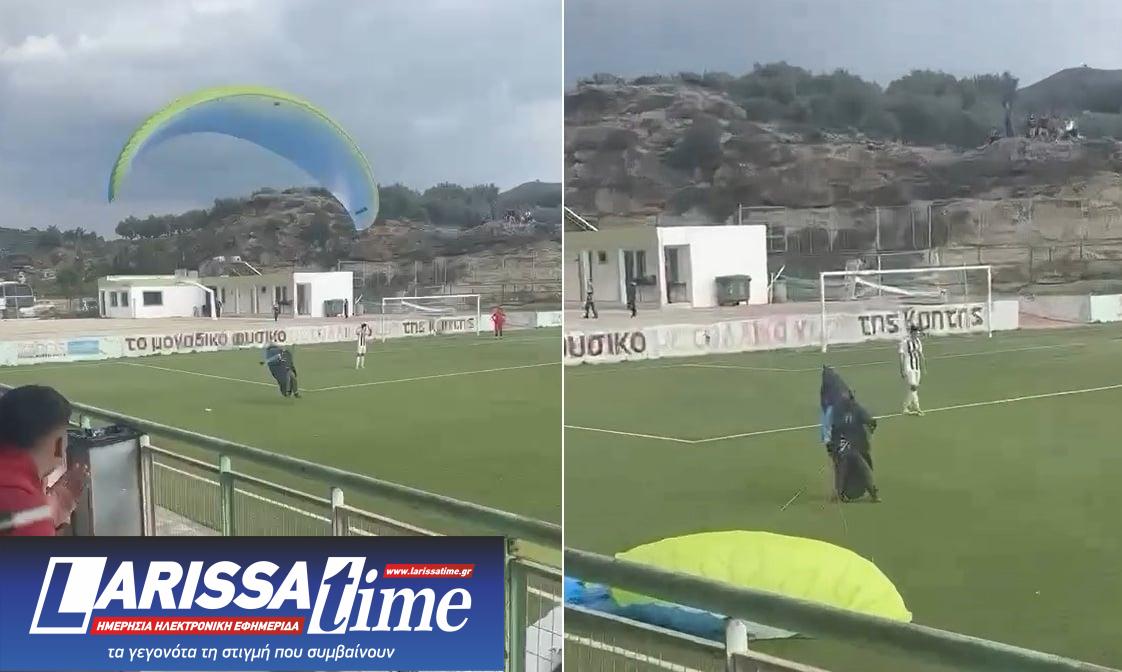 Την ώρα που η αναμέτρηση ανάμεσα στον ΑΟ Τυμπακίου και τη Νέα Ιωνία για την 27η αγωνιστική, βρισκόταν σε εξέλιξη, ένας αλεξιπτωτιστής που έκανε παραπέντε εμφανίστηκε ξαφνικά από τον ουρανό και προσγειώθηκε μέσα στον αγωνιστικό χώρο, αφήνοντας παίκτες, διαιτητές και φιλάθλους με το στόμα ανοιχτό.