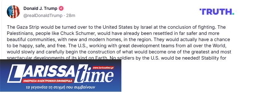 Απ’ ό,τι φαίνεται ο Ντόναλντ Τραμπ επιμένει στο σχέδιο του να μετατρέψει την Λωρίδα της Γάζας σε «Ριβιέρα της Μέσης Ανατολής», παρά τις διεθνείς αντιδράσεις. «Η Λωρίδα της Γάζας θα παραδοθεί στις Ηνωμένες Πολιτείες από το Ισραήλ στο τέλος των μαχών», τόνισε σε ανάρτηση του στο Truth Social ο πρόεδρος των ΗΠΑ.