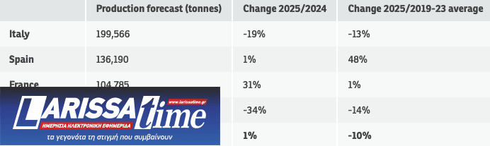 H παραγωγή στην Ισπανία αναμένεται να παραμείνει σταθερή σε σχέση με πέρυσι, ενώ στη Γαλλία αναμένεται επιστροφή σε φυσιολογικούς όγκους. Στην Ελλάδα το Europech προβλέπει μειωμένη παραγωγή, ειδικά στην περιοχή της Μακεδονίας που ταλανίστηκε από το χαλάζι, επιβεβαιώνοντας το σχετικό ρεπορτάζ του Fresher και του Λεωνίδα Λιάμη.