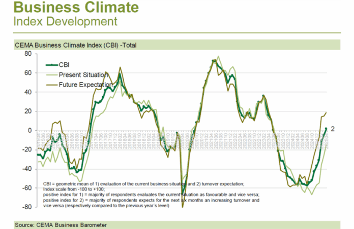 Όπως αναφέρει η CEMA, παρότι η πρόσφατη ανάκαμψη του επιχειρηματικού κλίματος οφείλεται κατά κύριο λόγω στις βελτιωμένες προβλέψεις για τις γενικότερο οικονομικές επιδόσεις της βιομηχανίας, πρόκειται για μια σημαντικά βελτιωμένη αξιολόγηση των ακόμα σχετικά αρνητικών επιχειρηματικών δραστηριοτήτων.