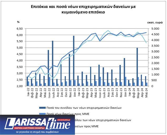 Το μέσο επιτόκιο των νέων επιχειρηματικών δανείων με συγκεκριμένη διάρκεια και κυμαινόμενο επιτόκιο μειώθηκε κατά 54 μονάδες βάσης και διαμορφώθηκε στο 5,39%. Το μέσο επιτόκιο των δανείων τακτής λήξης με κυμαινόμενο επιτόκιο προς μικρομεσαίες επιχειρήσεις (ΜΜΕ) αυξήθηκε κατά 5 μονάδες βάσης και διαμορφώθηκε στο 6,17%.