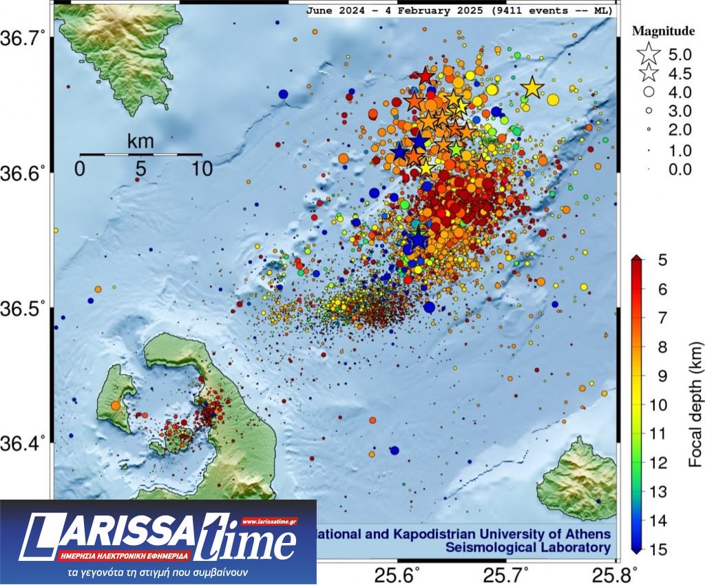 Από την έναρξη του σεισμικού σμήνους στη ζώνη Σαντορίνης-Αμοργού στις 26 Ιανουαρίου έως και τις 4 Φεβρουαρίου 2025, το Εργαστήριο Σεισμολογίας του ΕΚΠΑ έχει ανιχνεύσει και εντοπίσει συνολικά πάνω από 7,700 σεισμούς με μεθόδους μηχανικής μάθησης, εκ των οποίων άνω των 6,100 με μεγέθη Μ≥1.0. Στις 4 Φεβρουαρίου καταγράφηκαν πάνω από 1,300 σεισμοί με Μ≥1.0 (συγκριτικά λιγότεροι απ’ ότι στις 3 Φεβρουαρίου που καταγράφηκαν ~1,450 σεισμοί με Μ≥1.0). Το μέγιστο μέγεθος έφτασε το 4.9-5.0, ενώ εκδηλώθηκαν 21 σεισμοί με μεγέθη Μ≥4.0 και 9 σεισμοί με Μ≥4.5.