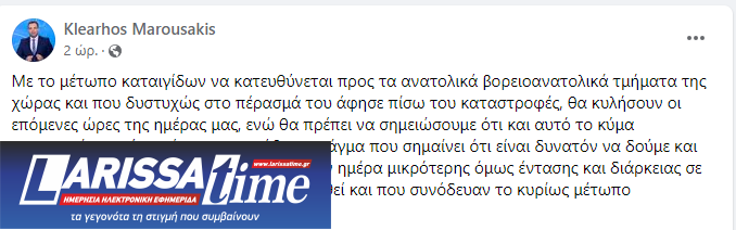 Στην ανάρτηση του αναφέρει: «Με το μέτωπο καταιγίδων να κατευθύνεται προς τα ανατολικά βορειοανατολικά τμήματα της χώρας και που δυστυχώς στο πέρασμά του άφησε πίσω του καταστροφές.