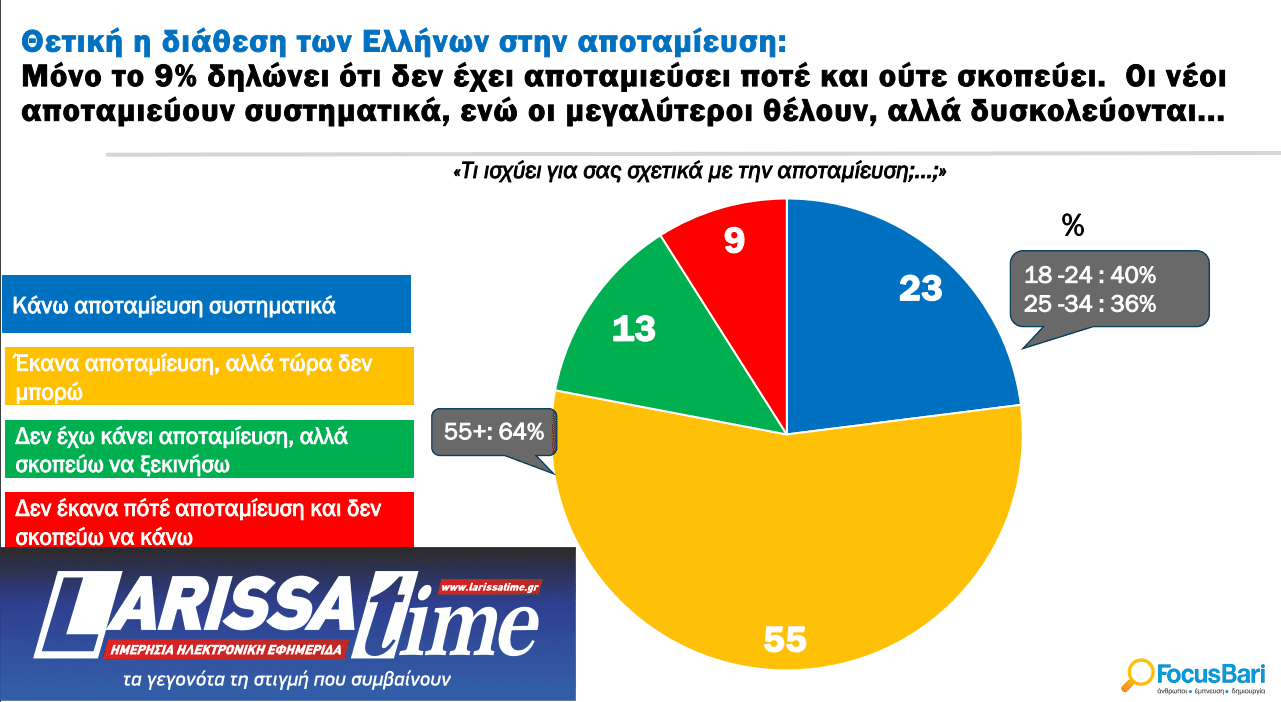 Παρόλα αυτά, η διάθεση για αποταμίευση παραμένει θετική, καθώς μόνο το 9% δηλώνει ότι δεν έχει αποταμιεύσει ποτέ και δεν σκοπεύει να το κάνει στο μέλλον.