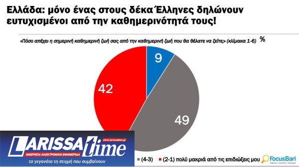 Ενδιαφέροντα και ανησυχητικά είναι τα ευρήματα έρευνας με θέμα «Επιδιώξεις – Όνειρα – Προσδοκίες», στην οποία συμμετείχε η Focus Bari που εκπροσωπεί στην Ελλάδα το διεθνές δίκτυο IRIS (International Research Institutes). Βάσει αυτής, μόνο ένας στους δέκα Έλληνες δηλώνουν ευτυχισμένοι από την καθημερινότητά τους.