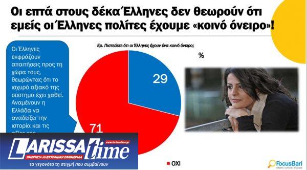 Επίσης, επτά στους δέκα δεν θεωρούν ότι οι Έλληνες πολίτες έχουν «κοινό όνειρο», με το 71% να πιστεύει ότι οι Έλληνες εκφράζουν απαιτήσεις προς τη χώρα τους, θεωρώντας ότι το ισχυρό αξιακό της σύστημα έχει χαθεί.