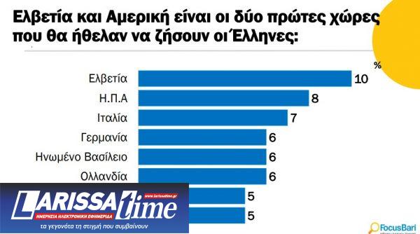 Έξι στους δέκα Έλληνες θα ήθελαν, αν μπορούσαν, να ζουν σε μια άλλη χώρα, κατά προτίμηση στην Ελβετία, στις ΗΠΑ, στην Ιταλία και άλλες.