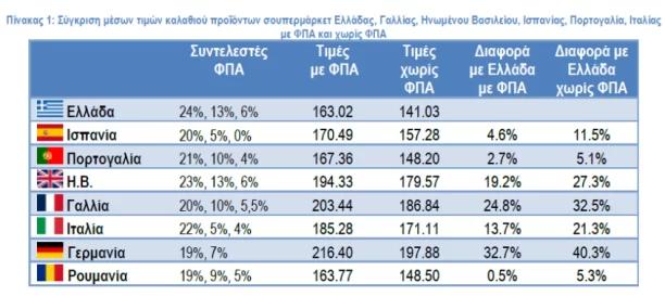 Η σύγκριση των μέσων τιμών των καλαθιών αποτυπώνει ότι και οι τέσσερεις χώρες έχουν σημαντικά ακριβότερο μέσο καλάθι από την Ελλάδα, 33% η Γερμανία, 25% η Γαλλία, 19% το Ηνωμένο Βασίλειο, 14% η Ιταλία, ενώ ακριβότερο κατά 3% η Πορτογαλία, 5% η Ισπανία και η Ρουμανία είναι περίπου στο ίδιο επίπεδο με την Ελλάδα.