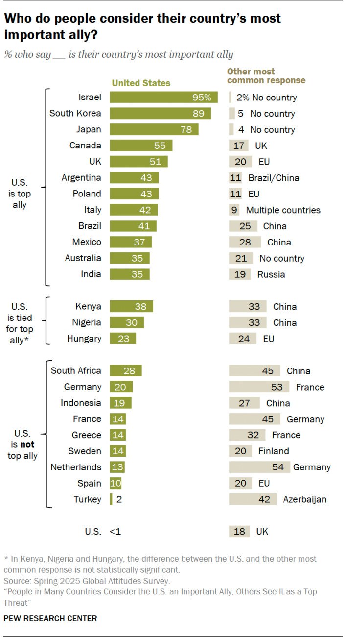 Οι Ισραηλινοί είναι ιδιαίτερα πιθανό να ονομάσουν τις ΗΠΑ ως τον πιο σημαντικό σύμμαχο της χώρας τους. Οι Ισραηλινοί ξεχωρίζουν επίσης για τις ιδιαίτερα θετικές τους αξιολογήσεις προς τις ΗΠΑ και τον πρόεδρο Ντόναλντ Τραμπ, όπως διαπιστώθηκε σε άλλη έρευνα του Pew Research Center. Σχεδόν όλοι οι Ισραηλινοί (95%) βλέπουν τις ΗΠΑ ως τον σημαντικότερο εταίρο.