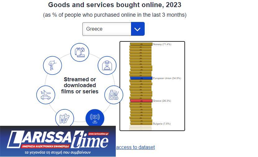 Τέλος, στις υπηρεσίες streaming και downloading η χώρα μας κινείται αρκετά κάτω από το μέσο όρο της ΕΕ (34,5%) με ένας στους τέσσερις (26,31%) να δηλώνουν πως αγόρασαν διαδικτυακά υπηρεσίες. Η Νορβηγία με 71,4% διαθέτει την πρωτιά στην κατηγορία.