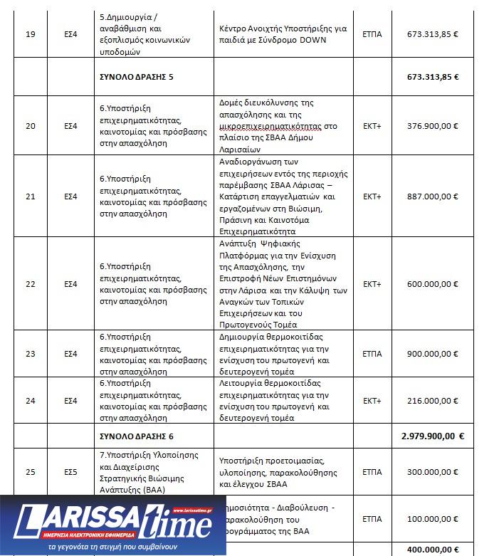 Ειδικά για τη Δράση «Υποστήριξη Επιχειρηματικότητας, Καινοτομίας & Πρόσβασης στην Απασχόληση» (ΕΤΠΑ και ΕΚΤ+, προϋπολογισμού 2,98 εκατ. ευρώ). Προχωράμε ένα βήμα -πιο αποφασιστικό- παραπέρα, για την ενίσχυση της επιχειρηματικότητας του τόπου μας με επιπλέον έργα και δράσεις, ύψους 1,7 εκατ. ευρώ: Δημιουργία θερμοκοιτίδας επιχειρηματικότητας για την ενίσχυση του πρωτογενή και δευτερογενή τομέα (ΕΤΠΑ, 0,9 εκατ. ευρώ), Λειτουργία θερμοκοιτίδας επιχειρηματικότητας για την ενίσχυση του πρωτογενή και δευτερογενή τομέα (ΕΚΤ+, 0,22 εκατ. ευρώ) [Θα λειτουργήσει στο Κονάκι Αβέρωφ, το οποίο ανακατασκευάζεται στο πλαίσιο της δράσης για την ανάδειξη της Πολιτιστικής Κληρονομιάς]. Ανάπτυξη ψηφιακής πλατφόρμας για την ενίσχυση της απασχόλησης, την επιστροφή νέων επιστημόνων στη Λάρισα και την κάλυψη των αναγκών των τοπικών επιχειρήσεων και του πρωτογενούς τομέα (ΕΚΤ+, 0,6 εκατ. ευρώ).