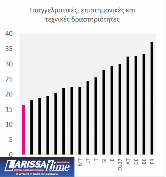 Στον κλάδο «Επαγγελματικές, επιστημονικές και τεχνικές δραστηριότητες», το ωρομίσθιο στη χώρα μας ανήλθε στα 16,48 ευρώ και είναι το χαμηλότερο ανάμεσα στις υπό εξέταση χώρες. Ο μέσος όρος στην ΕΕ-27 είναι σχεδόν διπλάσιος σε σύγκριση με την Ελλάδα και ανέρχεται στα 29,98 ευρώ, ενώ στην πρώτη θέση βρίσκεται η Γαλλία με 37,3 ευρώ.
