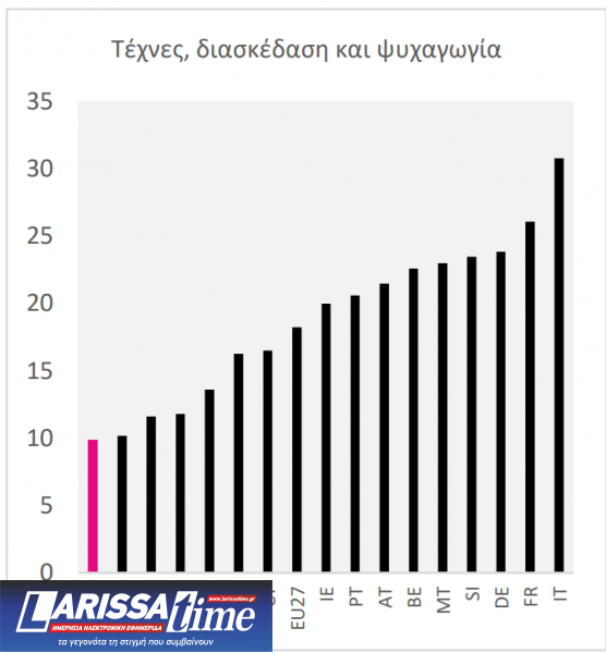 Στον κλάδο «Τέχνες, διασκέδαση και ψυχαγωγία» η Ελλάδα βρίσκεται στην τελευταία θέση της Ευρωζώνης, με ωρομίσθιο 9,85 ευρώ και είναι η μόνη χώρα από τις υπό εξέταση με ωρομίσθιο κάτω από 10 ευρώ. Χαρακτηριστικά, ο μέσος όρος της ΕΕ-27 είναι 18,24 ευρώ, ενώ στην Ιταλία το ωρομίσθιο είναι άνω των 30 ευρώ.