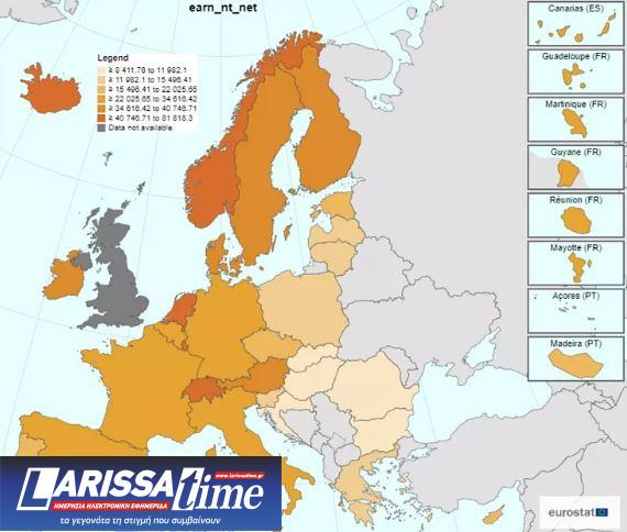 Σύμφωνα με τη Eurostat, ο μέσος ετήσιος μισθός κυμαίνεται από 81.818 ευρώ στην Ελβετία έως 15.335 ευρώ στην Ελλάδα για το 2022.