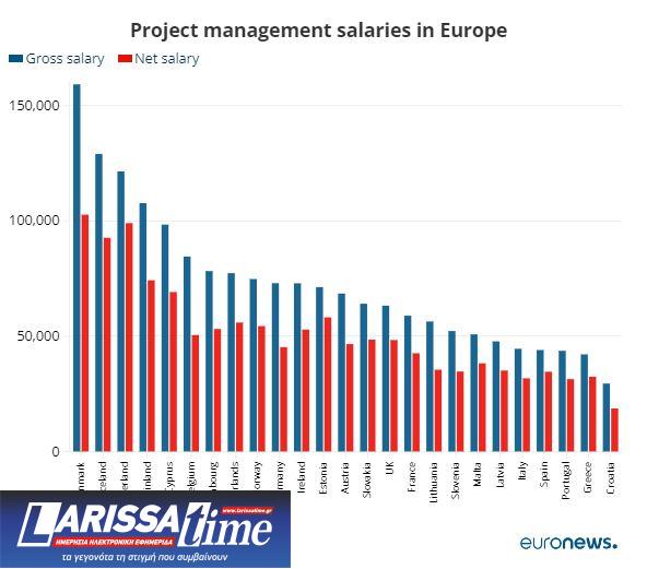 Σύμφωνα με τα στοιχεία που συνέλεξε το Euronews Business, ο διάμεσος μισθός του διευθυντή έργων (project manager) είναι ο υψηλότερος στη Δανία (σε όλα τα επίπεδα εμπειρίας και σε όλους τους κλάδους), αλλά όταν αφαιρεθούν ο φόρος εισοδήματος και οι εισφορές κοινωνικής ασφάλισης (που ανέρχονται συνολικά σε 35,5%), μπορεί να διαπιστώσετε ότι οι εταιρείες στην Ελβετία προσφέρουν σχεδόν εξίσου καλές προσφορές.