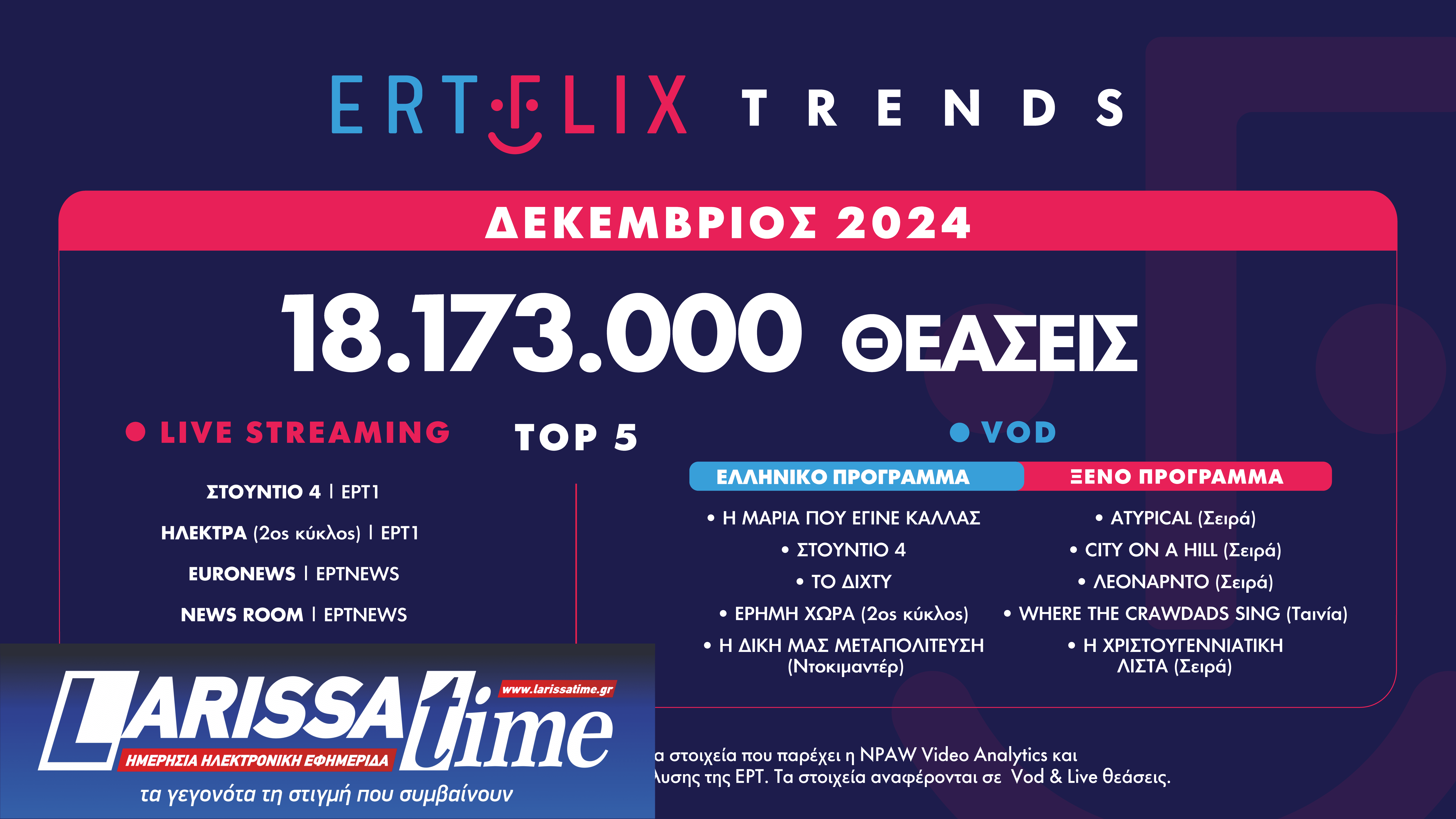Ο Δεκέμβριος έκλεισε με 18.173.000 θεάσεις, ενώ οι VOD θεάσεις έφτασαν σε ιστορικό υψηλό 15.200.000 (+23% από τον Δεκέμβριο 2023).