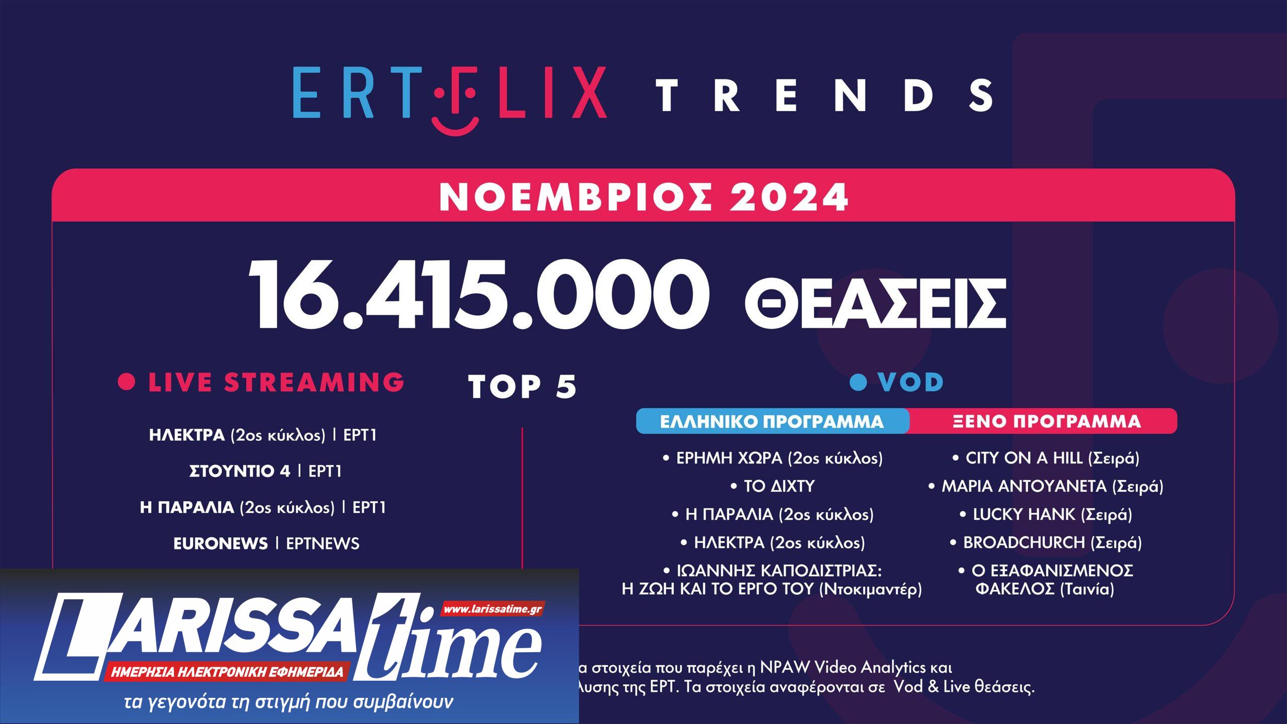 Με 16.415.000 θεάσεις έκλεισε το ERTFLIX τον Νοέμβριο, σημειώνοντας αύξηση κατά 17% σε σχέση με τον ίδιο μήνα πέρυσι.
