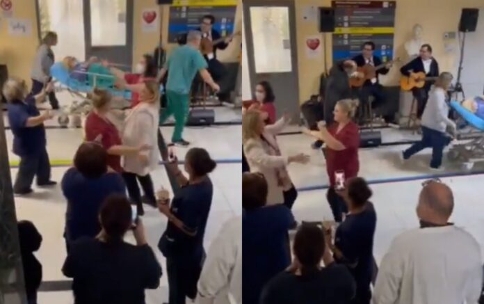 Στα πλάνα, που δημοσιεύτηκαν στα social media, διακρίνονται μέλη του προσωπικού του νοσοκομείου να τραγουδούν και να χορεύουν, ενώ τραυματιοφορείς μεταφέρουν ασθενή με φορείο ανάμεσα σε εκείνους και την ορχήστρα.