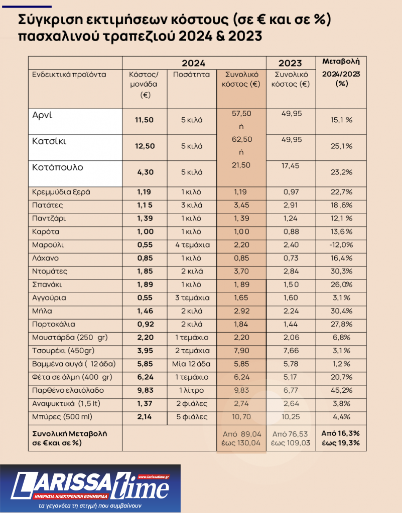 Η εκτίμηση του κόστους για το φετινό πασχαλινό τραπέζι (6-8 ατόμων) κυμαίνεται από 89,04 έως 130,04 ευρώ. Με άλλα λόγια, οι καταναλωτές που θα προβούν στις ίδιες αγορές με πέρυσι από αντίστοιχα καταστήματα θα αντιμετωπίσουν μια μεταβολή της τάξης του 16,3% έως 19,3% σε σύγκριση με το 2023.