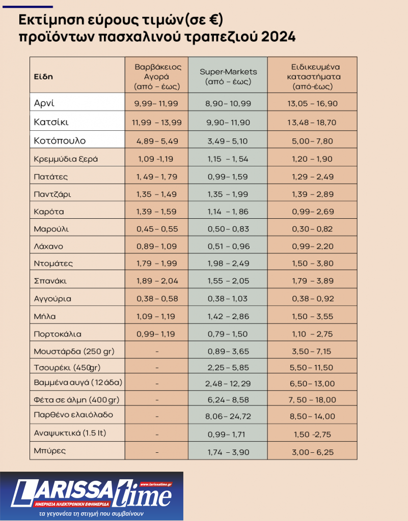 Το ΙΝ.ΕΜ.Υ. της ΕΣΕΕ πραγματοποίησε, κατά το διάστημα 26-29 Απριλίου 2024, ενδεικτική καταγραφή των τιμών πώλησης των προϊόντων του πασχαλινού τραπεζιού, με τη μέθοδο της επιτόπιας παρατήρησης σε εμπορικές αγορές της Αττικής και διαμέσου τηλεφωνικής συνέντευξης για τη Θεσσαλονίκη.