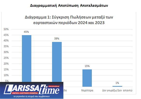 1. Κατά τη φετινή εορταστική περίοδο σχεδόν οι μισές επιχειρήσεις (45%) κατέγραψαν υψηλότερες πωλήσεις συγκριτικά με πέρυσι, ενώ επίσης υψηλό ήταν το ποσοστό (39%) επιχειρήσεων που παρέμεινε στα περυσινά επίπεδα (Διάγραμμα 1).
