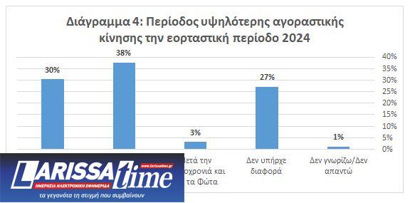 4. Σε παλαιότερες έρευνες, η καλύτερη περίοδος για την αγοραστική κίνηση εντοπιζόταν στο χρονικό διάστημα που προηγείτο των Χριστουγέννων, εξαιτίας και της καταβολής του δώρου. Ωστόσο φέτος για 4 στις 10 επιχειρήσεις (38%), η αγοραστική κίνηση κορυφώθηκε μεταξύ Χριστουγέννων και Πρωτοχρονιάς (Διάγραμμα 4).