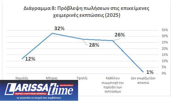 8. Οι συσσωρευμένες προκλήσεις και τα εμπόδια στην αγορά, σε συνδυασμό με τις μέχρι σήμερα εξελίξεις, ενισχύουν ελαφρώς τις προσδοκίες των επιχειρήσεων σχετικά με τις προβλέψεις τους για τις πωλήσεις κατά τη διάρκεια των χειμερινών εκπτώσεων του 2025 (Διάγραμμα 8). Μία στις τρείς επιχειρήσεις (32%) θεωρεί πως οι συγκεκριμένες πωλήσεις θα διαμορφωθούν σε μέτρια επίπεδα, το 28% αναμένει βελτίωση, ενώ το 26% δεν συμμετέχει στις εκπτώσεις (τρόφιμα).