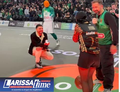 Τα φώτα άναψαν ξανά και ένας φίλαθλος του Παναθηναϊκού είχε πάρει θέση στο glass floor για να κάνει πρόταση γάμου στην αγαπημένη του, κρατώντας το δαχτυλίδι στο χέρι του.