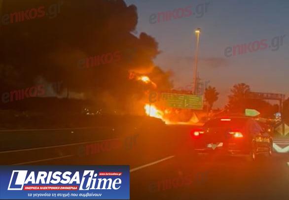Από την ανατροπή προκλήθηκε μεγάλη φωτιά, η οποία πλέον έχει σβήσει, ωστόσο πυροσβεστικές δυνάμεις παραμένουν στο σημείο.