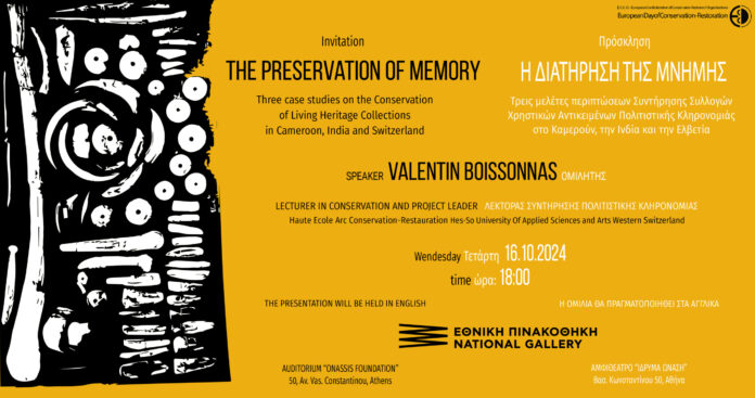 Η Εθνική Πινακοθήκη-Μουσείο Αλεξάνδρου Σούτσου, με αφορμή τις Ευρωπαϊκές Ημέρες Συντήρησης και Αποκατάστασης 2024, προσκάλεσε τον Ελβετό συντηρητή αντικειμένων πολιτιστικής κληρονομιάς Valentin Boissonnas, να παρουσιάσει μέρος της δουλειάς του, την Τετάρτη 16 Οκτωβρίου στις 18:00.