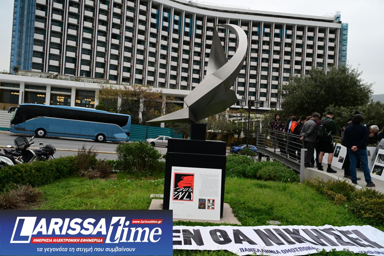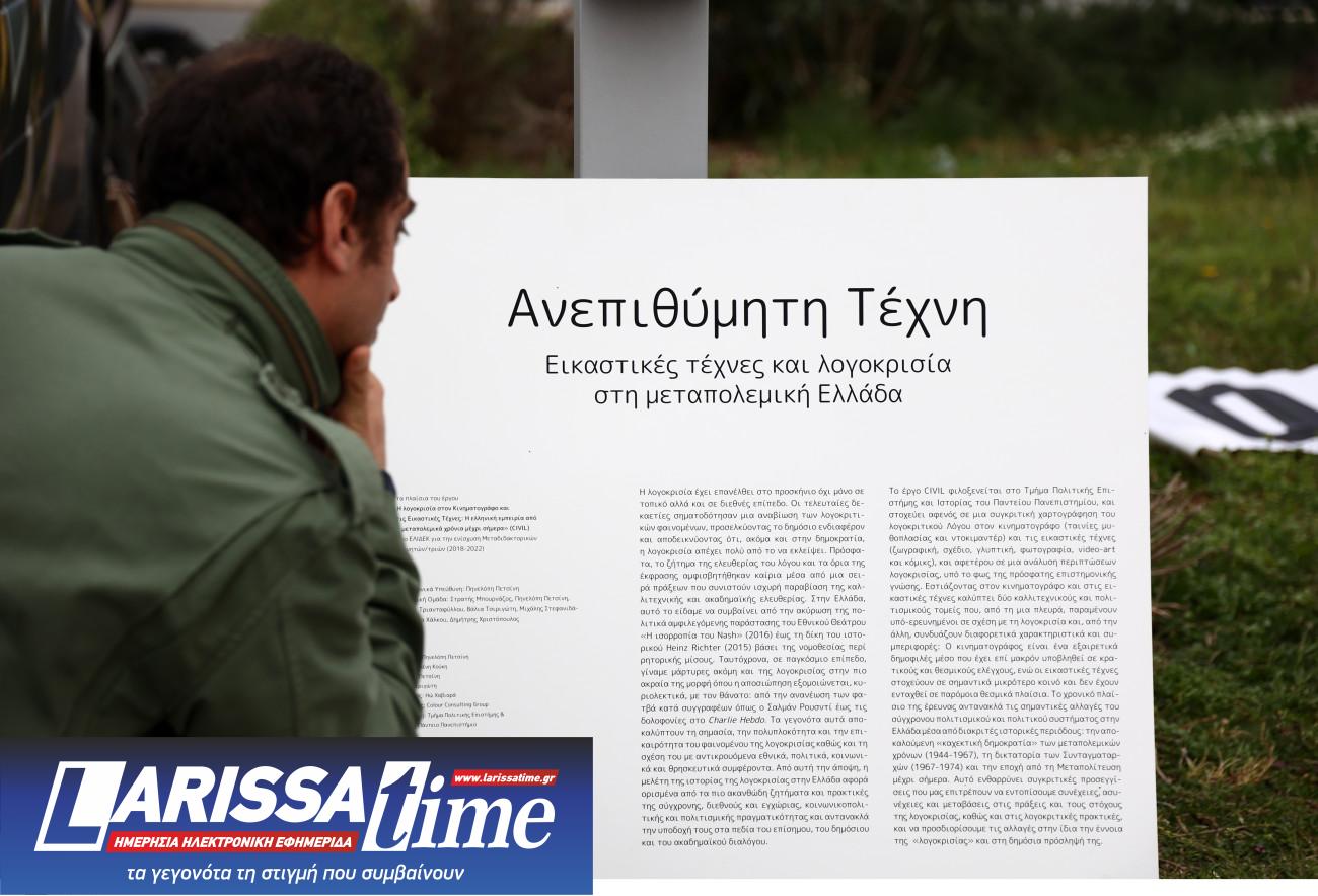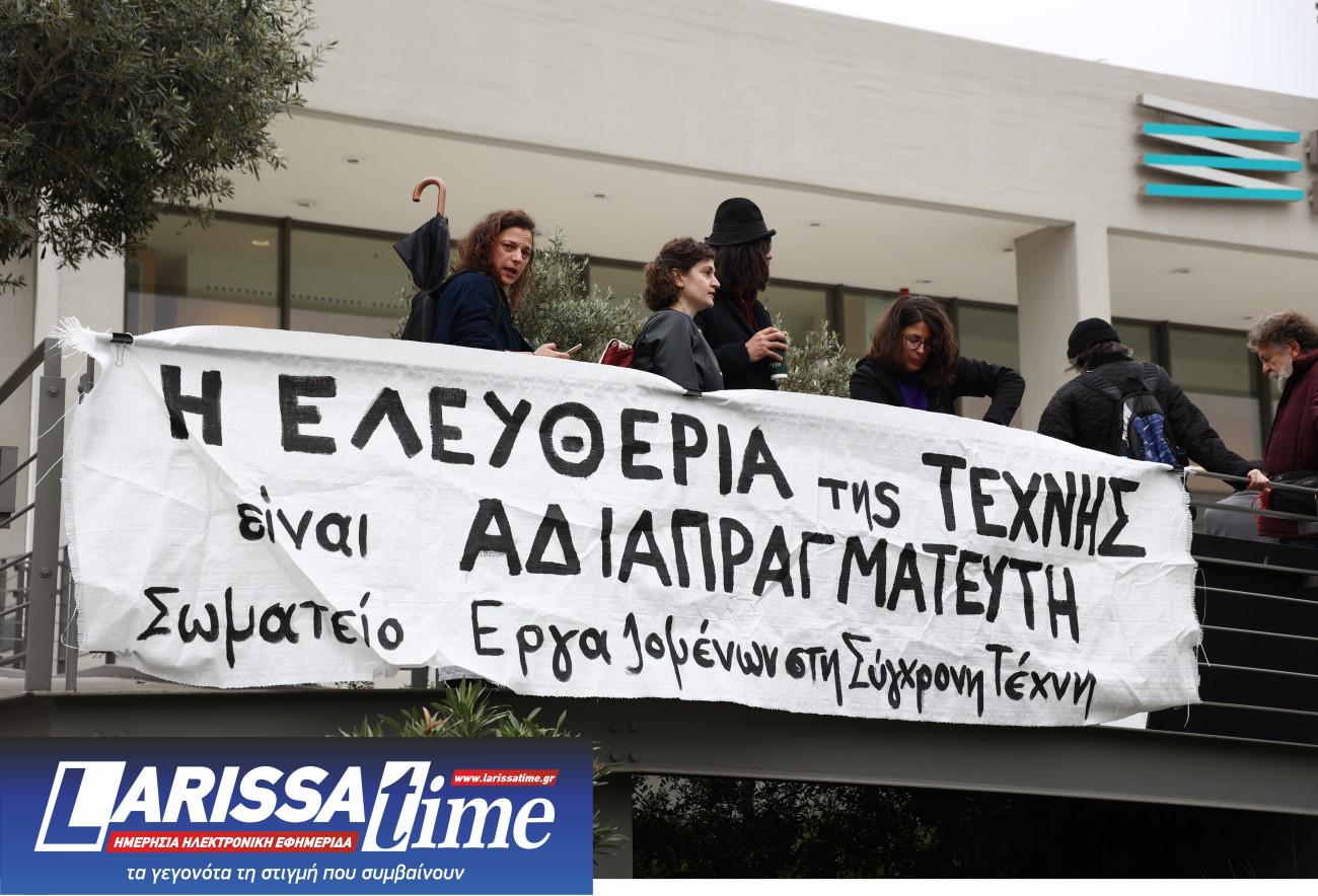 Το συγκεντρωμένο πλήθος διαμαρτυρήθηκε για την αποκαθήλωση των έργων του Χριστόφορου Κατσαδιώτη («Η Σαγήνη του Αλλόκοτου») που συνιστά ήττα της ελευθερίας της τέχνης.